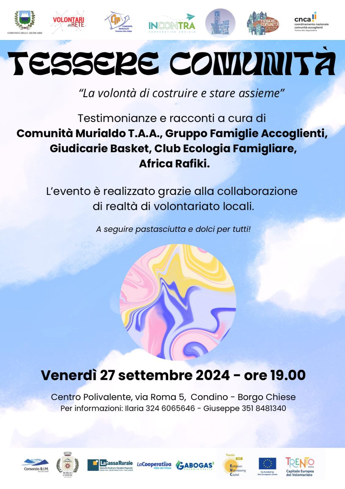 l gruppo Volontari in Rete della Comunità delle Giudicarie, in collaborazione con Comunità Murialdo T.A.A, La Cooperativa Sociale Incontra, la Pro Loco di Condino in occasione della Settimana dell'Accoglienza promossa dal Coordinamento Nazionale Comunità Accoglienti in tutto il Trentino Alto Adige, e all'interno dell'anno di Trento Capitale Europea del Volontariato 2024, organizzano una serata dal titolo "Tessere Comunità. La volontà di costruire e stare insieme"